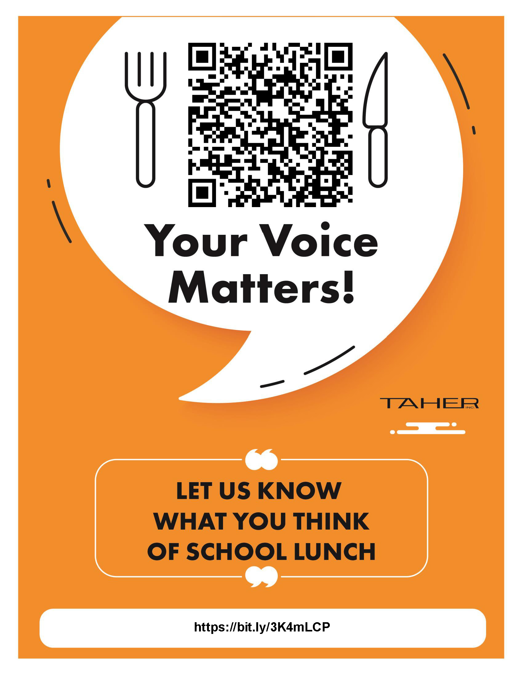 Taher, Eagle Ridge Academy's Food Service provider, would like to hear your thoughts on school breakfast and lunch! Please take this brief survey to let us know how we are doing and how we can improve. The survey can be completed by parents and all students, grades K-12. Students that bring in proof of completed surveys will receive one free lunch item. |