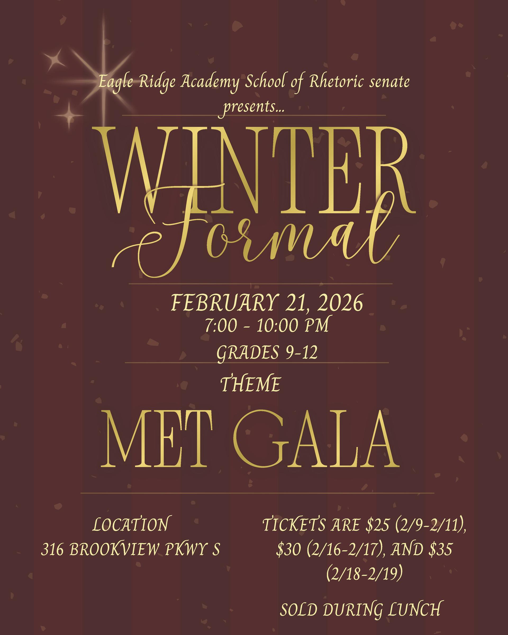 School of Rhetoric Winter Formal will take place in the Bassett Creek Room at Brookview Golden Valley on Saturday, February 21, 7:00-10:00 p.m. Tickets will be sold during School of Rhetoric lunch for $30 each February 16-17, and $35 each February 18-19. This year’s theme is “Met Gala”.